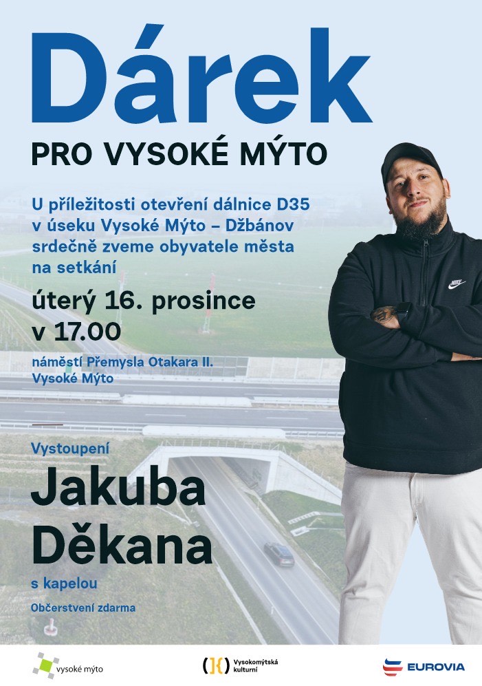Dovolujeme si vás pozvat na jedinečnou událost. Při příležitosti otevření dálnice D35 v úseku Vysoké Mýto – Džbánov vás srdečně zveme na setkání v úterý 16. prosince v 17.00 na náměstí Přemysla Otakara II. ve Vysokém Mýtě. V programu vystoupí Jakub Děkan s kapelou. Občerstvení zdarma.